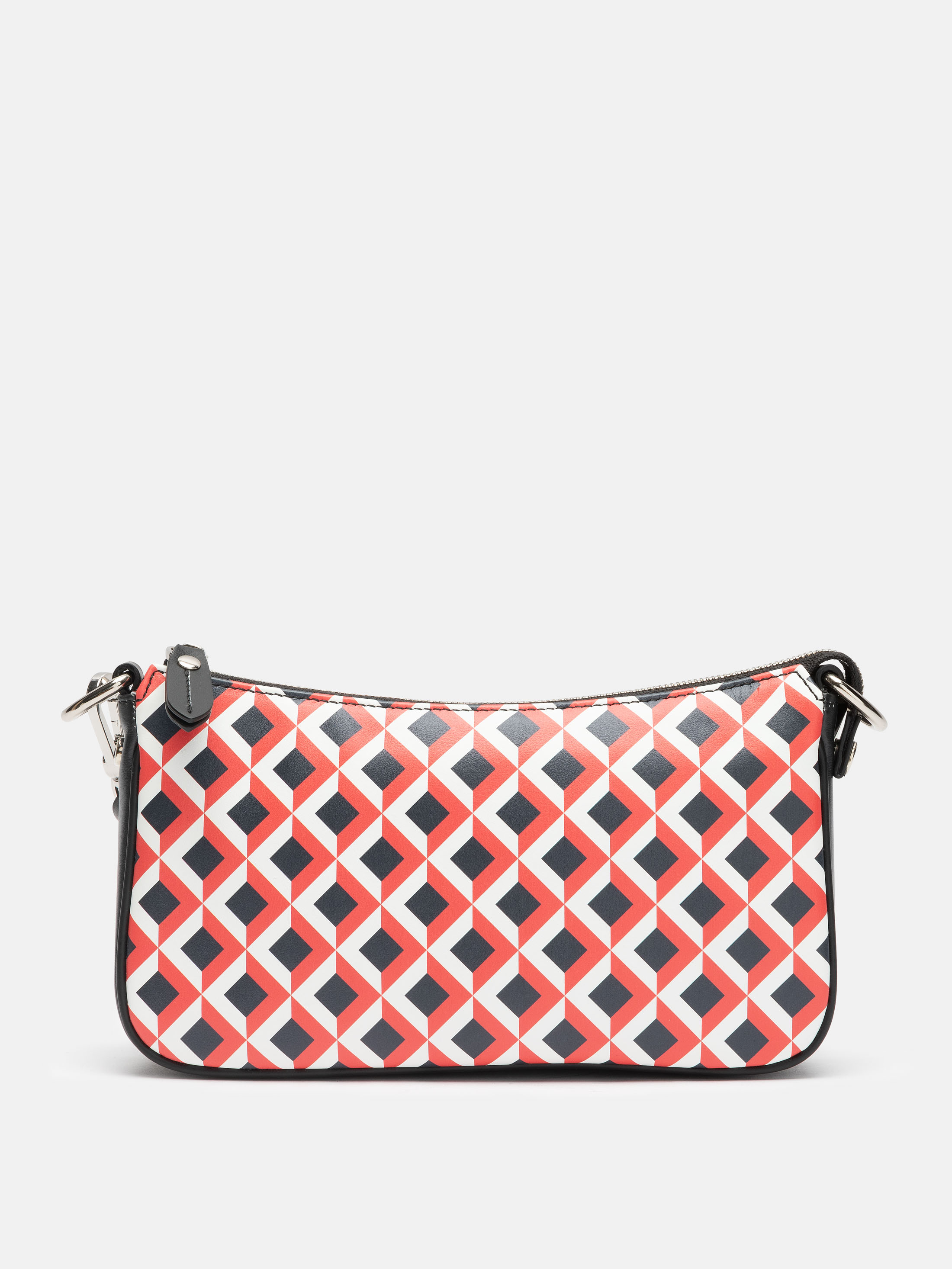 El cuerpo de tu bolso baguette de diseño está hecho de cuero de Nappa tanto liso como texturizado, con un forro interno de ante. Todas las partes funcionales del bolso están hechas de cuero de Nappa, incluyendo el tirón de la cremallera, los ribetes y las tiras que sostienen los acabados metálicos.
