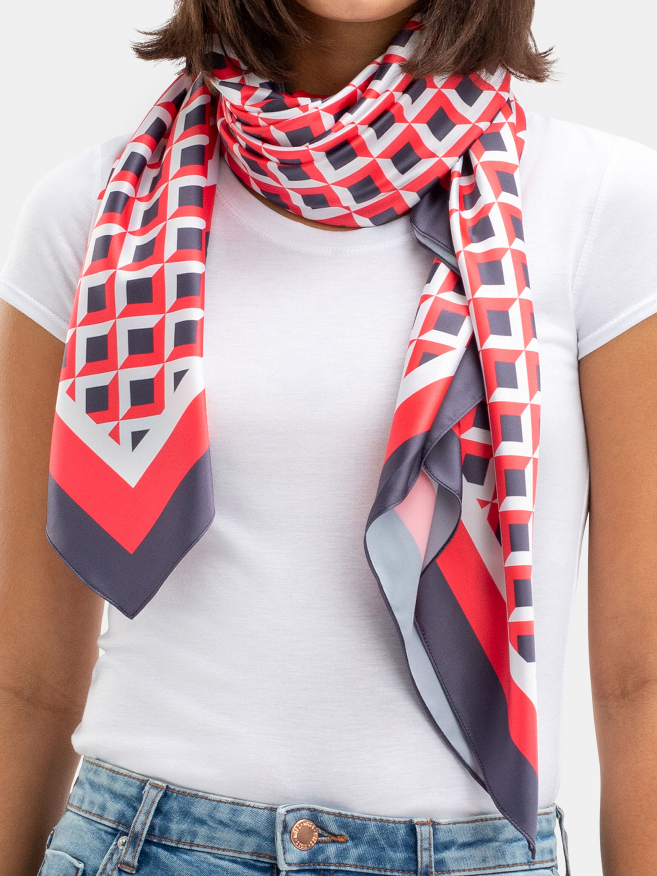 Pin todos los rincones del pañuelo cuadrado personalizado y expresa tu personalidad mostrando tus mejores diseños. Elige entre múltiples tejidos y dos tamaños de cuadrados, entre 90x90cm o 115x115cm. Las opciones de bufandas cuadradas estampadas en seda pueden ser en Silk Satin real y Georgette Silk, o alternativamente, puedes optar por un tejido base de poliéster, como Sensation Silk, Parisian Chiffon o Muslin. Todos estos tejidos aportan una fantástica caída y una agradable ligereza para bufandas de verano o como complemento para utilizar durante todo el año. Tu bufanda cuadrada personalizada está hecha a mano por nosotros y terminada con un dobladillo estándar o una puntada overlock. También está disponible una caja de metal para personalizar y darle un toque extra que no pasa desapercibido.