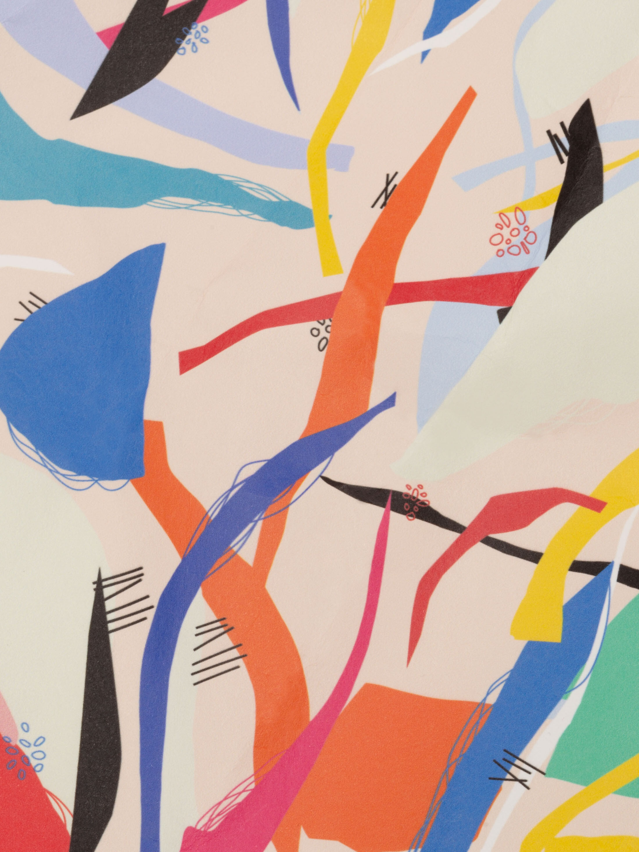 El color base del Scroll es de un blanco roto con acabado mate, mostrando unos colores vivos y contrastados pero con tonos ligeramente más claros que en el diseño original. Al ser un material totalmente liso y no tejido, muestra los detalles y líneas a la perfección y en alta definición.