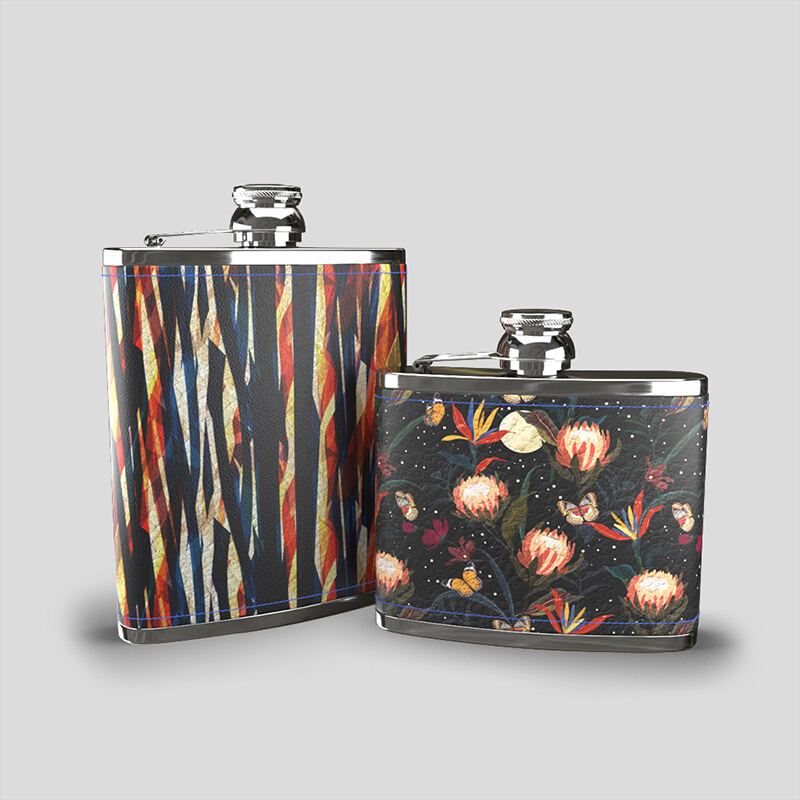 Tu petaca personalizada consta de dos elementos separados que se juntan en nuestros talleres para darle el acabado perfecto. Por un lado, las petacas de acero inoxidable de Marlborough of England, y por el otro el forro de cuero que Contrado imprime con tus diseños. El cuero napa o cuero sintético, según elijas, se estampa con una técnica profesional y después se corta a medida. El forro se cose a mano con la costura del color que prefieras. Está cortado de una sola tira de material, de manera que el motivo no siempre coincide en la juntura. Usa la vista previa en la herramienta en línea para saber cómo va a quedar.