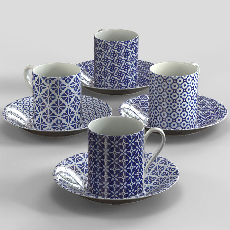Si, cuando diseñas la taza también diseñas el plato. Los platos son de la misma porcelana de hueso de alta calidad y la decoración cubre toda la superficie.